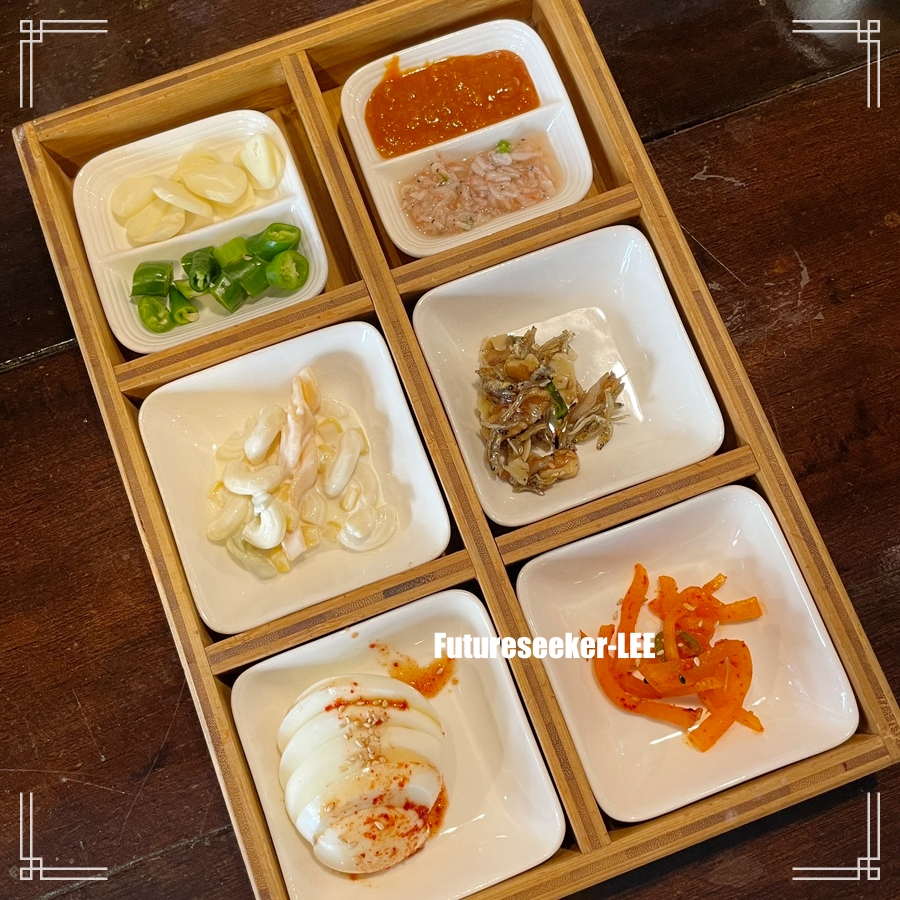 여기가 진짜 서울 맛집이라고 할 수 있는 이유는 밑반찬을 전부 직접 만들기 때문입니다. 다른 곳은 그냥 사니까 색감도 흐리멍텅한데요. 여기는 아주 깔끔해서 빨리 먹고 싶은 비주얼입니다.